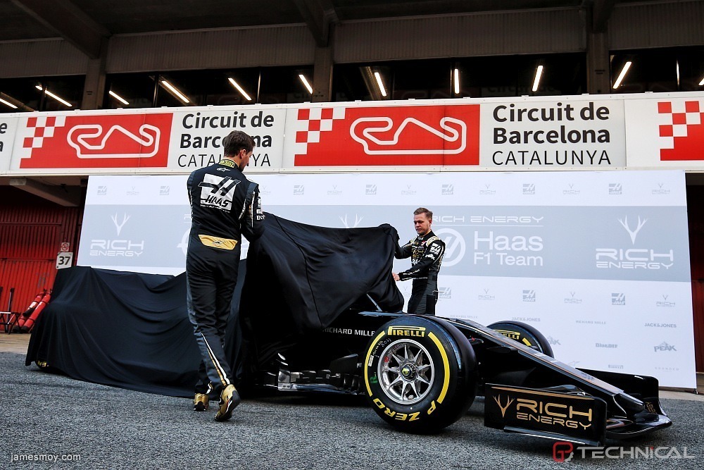 (L to R): Romain Grosjean (FRA) Haas F1 Team and Kevin Magnussen (DEN) Haas F1 Team unveil the Haas VF-19.Formula One Testing, Day 1, Monday 18th February 2019. Barcelona, Spain.