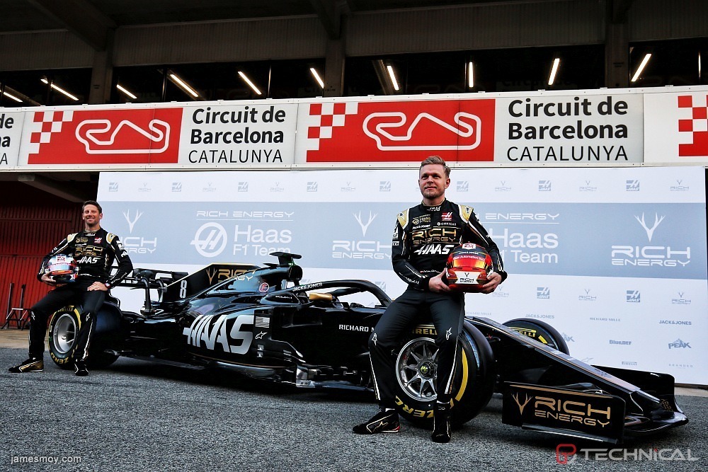(L to R): Romain Grosjean (FRA) Haas F1 Team and Kevin Magnussen (DEN) Haas F1 Team with the Haas VF-19.Formula One Testing, Day 1, Monday 18th February 2019. Barcelona, Spain.
