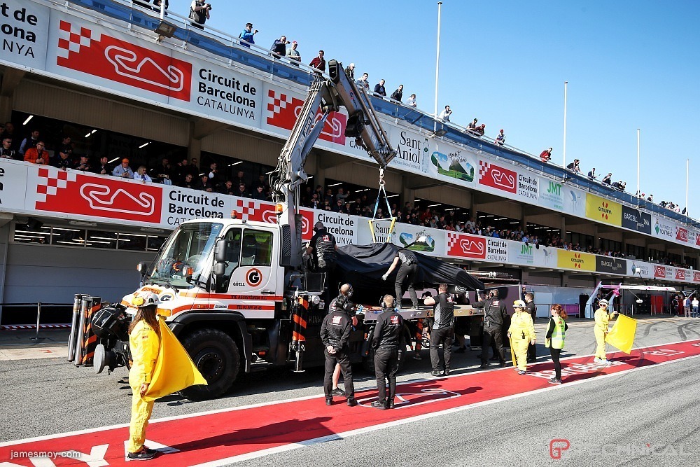 The Haas VF-20 of Kevin Magnussen (DEN) Haas F1 Team is recovered back to the pits on the back of a truck.Formula One Testing, Day 3, Friday 21st February 2020. Barcelona, Spain.
