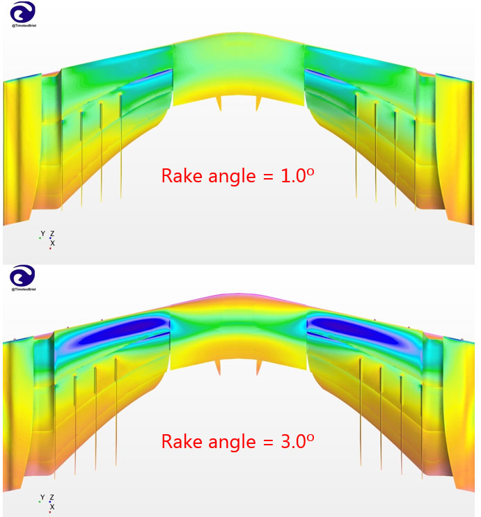 In Figure 11 surface pressure plots are depicted for a F1 car CFD model with a rake angle of 1.0° (top view) and 3.0° (bottom view). Low-pressure areas are represented in coloured blue and high-pressure in red. It is evident that at 3.0 degrees, blue areas increase substantially, indicating that the front wing is generating more downforce due to ground effect.