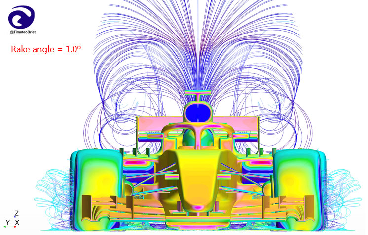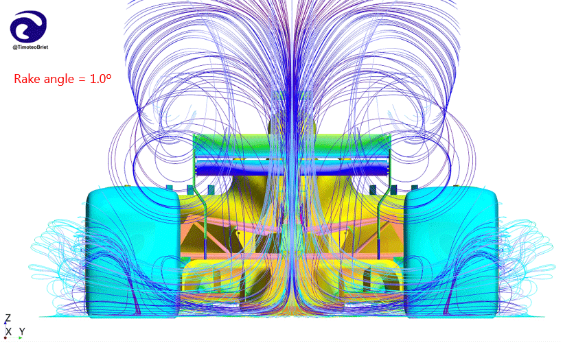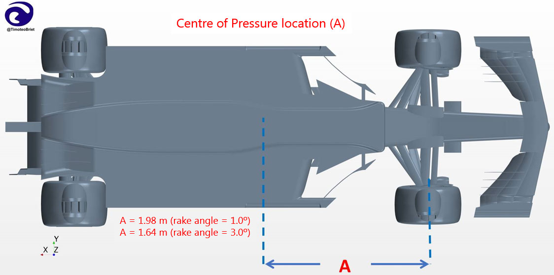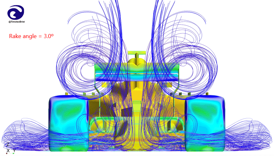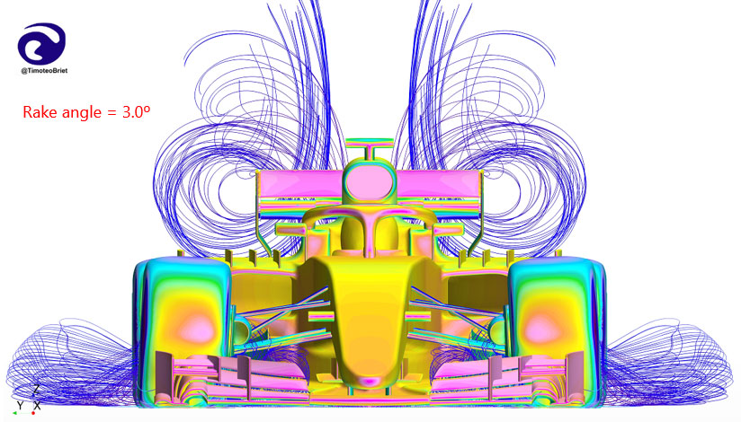 Note that the car on which the analysis has been performed is not optimised to work with a 3.0 rake angle; therefore, by carrying out a good development and optimisation work, the total DWF and the aerodynamic efficiency could be increased considerably.
