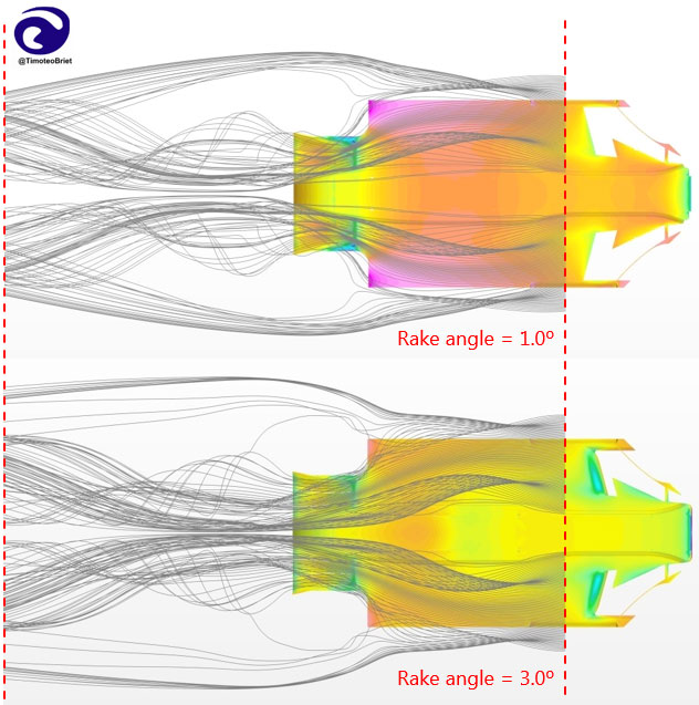 Remembering that the high-rake car (when it is braking or when cornering in low-speed corners), thanks to the reduction of the front wing clearance height with respect to the track surface, is able to generate a higher DWF value in the front axle, due to the increased ground effect on the lower part of the front aileron, its flaps and the lower part of the nosebox. Because of its inclination, the entire front wing assembly works as a front diffuser, rather than a wing, allowing to brake more deeply into the corner and to reduce the degree of understeer. This reduces the braking and traverse times on low-speed corner, due to the increased driving speed with the car under control. In this way, it is possible to anticipate the application of power on corner exit, as the higher DWF of the front wing means that it does not suffer from critical understeer on entry and exit of slow corners, allowing it to accelerate before fully exiting the corner. At this point, the car has a lower vertical stiffness in the rear axle than the stiffness on a straight line (and a lower value than that of the low-rake cars), which allows the vehicle to develop power in a more progressive way, without reaching the sliding limit of the rear tyres (as explained in the first part of this report).