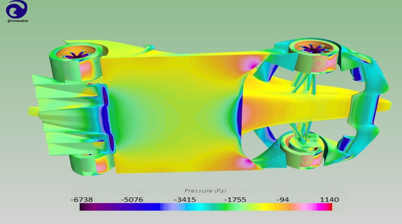 In Figure 2 and 3 there are some views of the car (a Formula-E) used to verify the pressure distribution under the floor-diffuser system explained above, by means of CFD analysis (test conditions: air speed = 250 km/h, rake angle = 1°, rotating tyres and rims).
