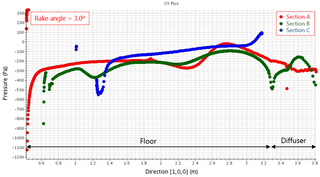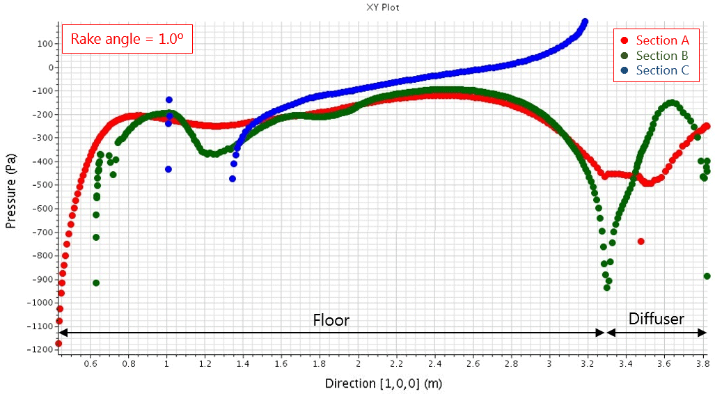 The resulting pressure distributions are shown in Figure 15 (for the case of the 1.0° rake angle car) and Figure 21 (for the 3.0 rake angle car). Starting from the left of the plots, the first part of each curves corresponds to the beginning of the flat floor, whereas the end part corresponds to the end of the diffuser (if applicable).