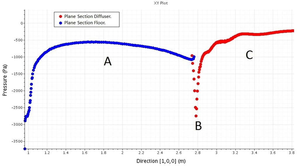 Figure 4 shows the pressure distribution at the centre line under of the car, where "A" corresponds to the floor section, “B” is just the aforementioned “Crack Pressure” or “braking line” and “C” is the diffuser section. It can be notice exactly what has been explained before: "B", a noticeable low pressure, a greater average pressure in "C" than in "A"; in fact, the diffuser produces little total load, compared to the floor.