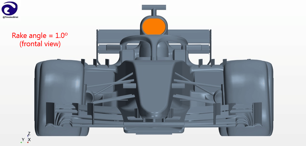 The analysis is carried out based on the setups, represented in Figures 7 and 8 (1 rake angle) and in Figures 8 and 9 (3° rake angle), that are imposed on a basic model of an F1 car.