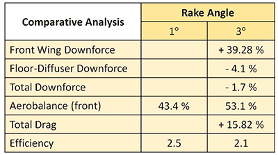 Table 1 – Numerical results of simulations with a F1 car CFD model at two rake angles