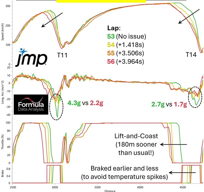 In Turn 11, the acceleration forces came down from 4.3g to just 2.2g while it decreased from 2.7g to just 1.7g into the last hairpin.