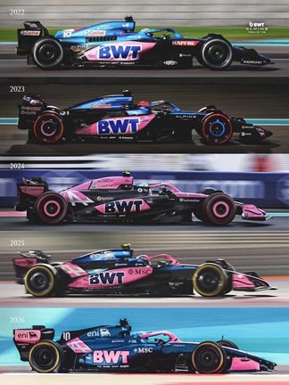 2026: Streamlined, Mature, and PurposefulBy 2026, Alpine had settled into a refined visual language. The blue‑and‑pink combination remained, but the design became sleeker and more aerodynamic in appearance, mirroring the new era of F1 regulations.