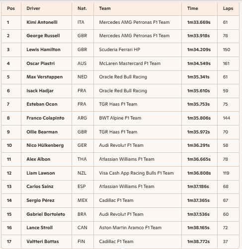 Lewis Hamilton finished the day in third place after completing a full programme for Ferrari. His best lap of 1m 34.209s left him just over half a second behind Antonelli, and he spent much of the day focusing on longer runs and tyre behaviour.