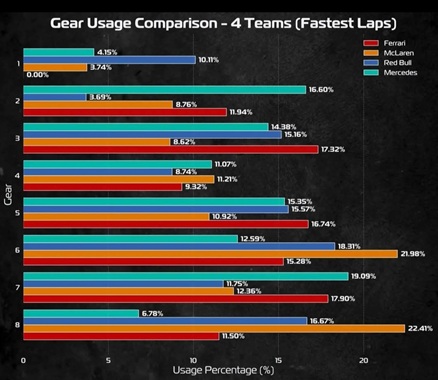 Ferrari’s gear‑usage profile stands out for the opposite reason. The team did not spend any time on its fastest lap in first gear and only 3.69 percent in second gear.