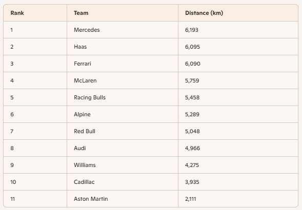 While lap times tend to dominate fan discussions, total mileage remains one of the most valuable metrics for judging how ready each team truly is—and this year’s numbers highlight a striking spread across the grid.