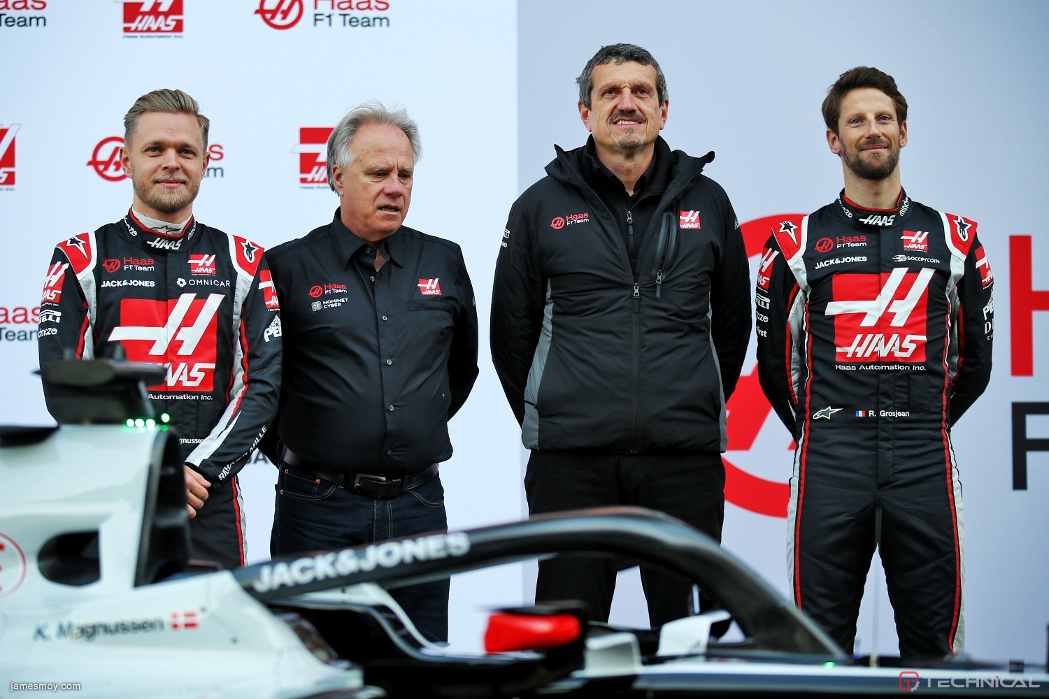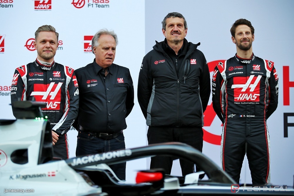 (L to R): Kevin Magnussen (DEN) Haas F1 Team; Gene Haas (USA) Haas Automotion President; Guenther Steiner (ITA) Haas F1 Team Prinicipal; and Romain Grosjean (FRA) Haas F1 Team, with the new Haas VF-20.Formula One Testing, Day 1, Wednesday 19th February 2020. Barcelona, Spain.