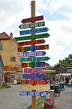 | Title | Signpost in Christiania (Copenhagen). | Artistic peace symbol at Toronto Distillery District |