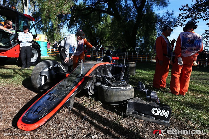 The damaged McLaren MP4-30 of Kevin Magnussen (DEN) McLaren after he crashed in the second practice session.Australian Grand Prix, Friday 13th March 2015. Albert Park, Melbourne, Australia.