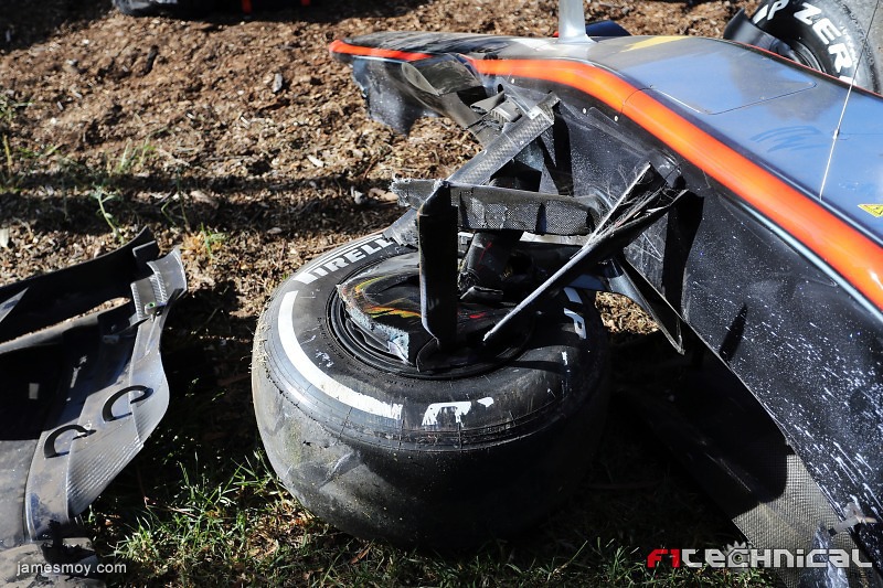 The damaged McLaren MP4-30 of Kevin Magnussen (DEN) McLaren after he crashed in the second practice session.Australian Grand Prix, Friday 13th March 2015. Albert Park, Melbourne, Australia.