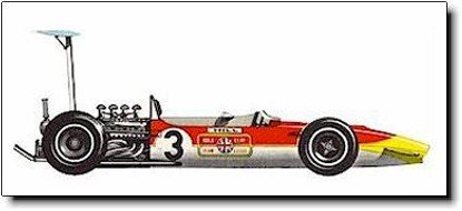 The Lotus-Ford 49 would continue to serve Lotus for the next three years. Evolving from the classic British Green racer sans wings to the red, white and gold moving cigarette pack with tall and then low wings. The car would power Graham Hill to the 1968 World Championship after the tragic death of Clark in a meaningless Formula 2 race. In 1970 Jochen Rindt scored a legendary victory over retiring three-time World Champion Jack Brabham at Monaco. That Ford Cosworth DFV or double-four-valves would eventually become the engine of choice for all of the British teams leading to the growth of Formula 1 in the years to come. The impact of Ford's decision to make the engine available to any manufacturer cannot be underestimated and is directly responsible to the domination of the British teams in chassis design now that they were more or less free of any responsibility for the engine.